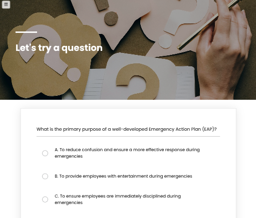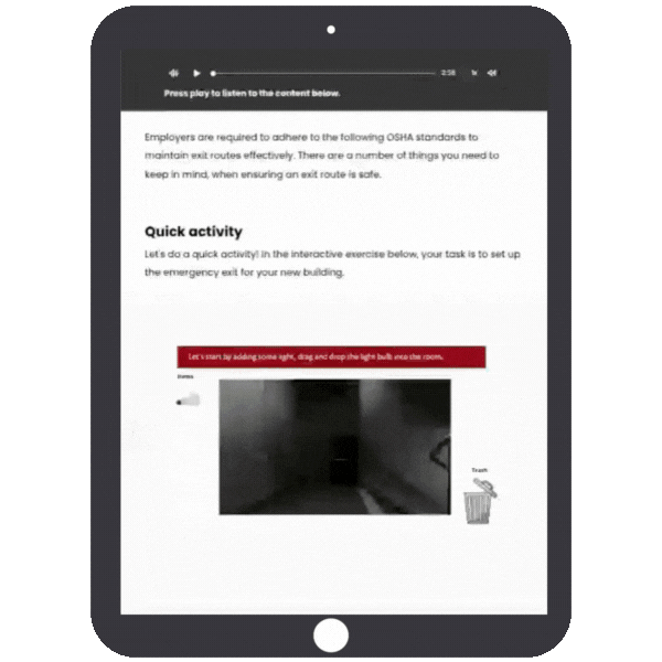 The final modules featured modern, reflowable layouts that ensured accessibility across devices. Custom interactivities, such as cleaning and preparing an emergency exit, helped learners actively apply key safety principles. Cinematic videos, hotspots, flip cards, immersive scenarios, case studies, knowledge checks and reflective questions deepened understanding, connecting regulations to real-world applications.